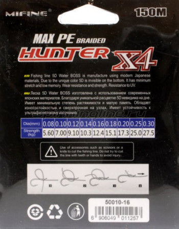 • Шнур Mifine Hunter X4PE 150м 0,08мм